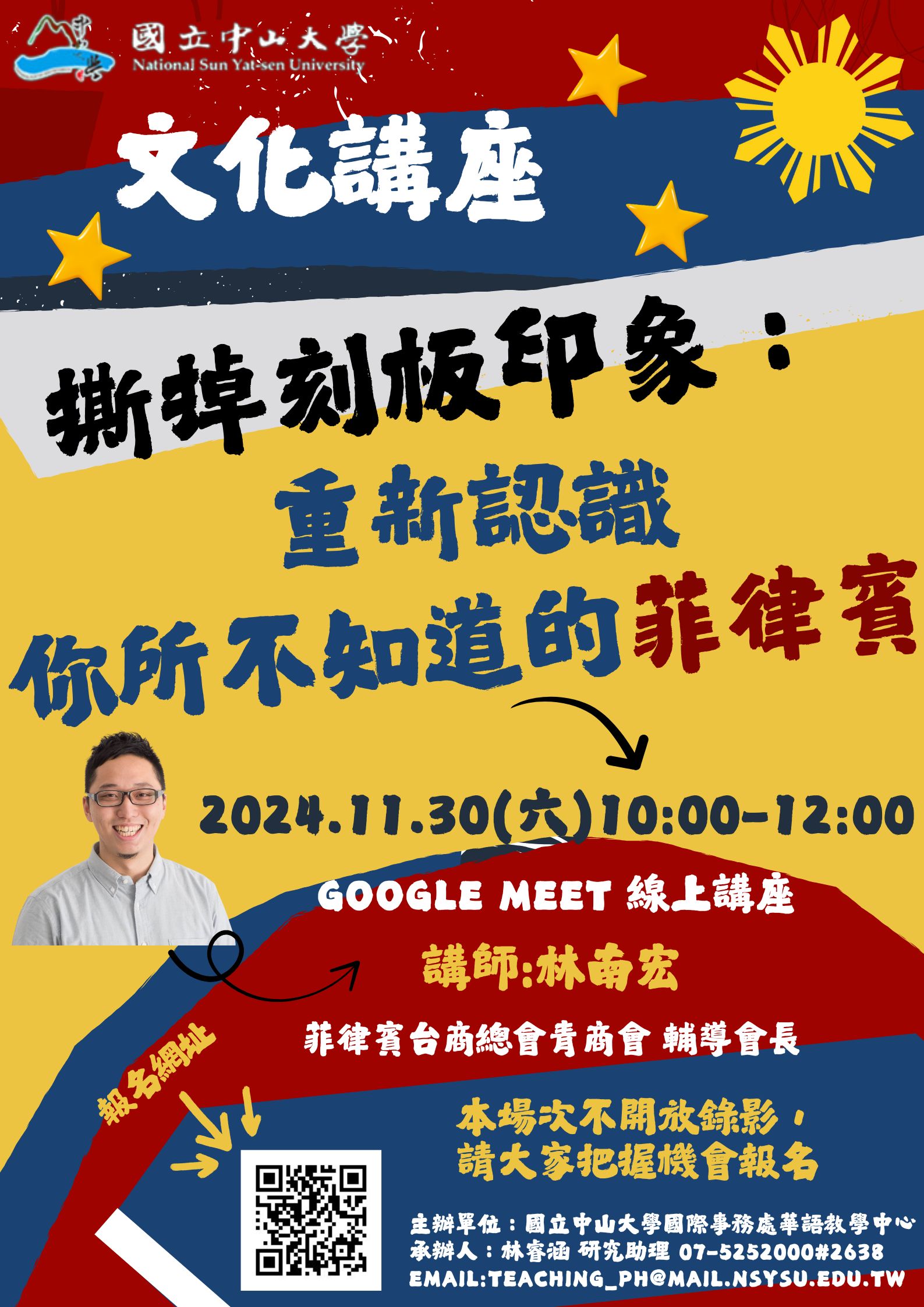 【訊息公告】國立中山大學國際事務處華語教學中心辦理「菲律賓文化線上講座-撕掉刻板印象:重新認識你所不知道的菲律賓」