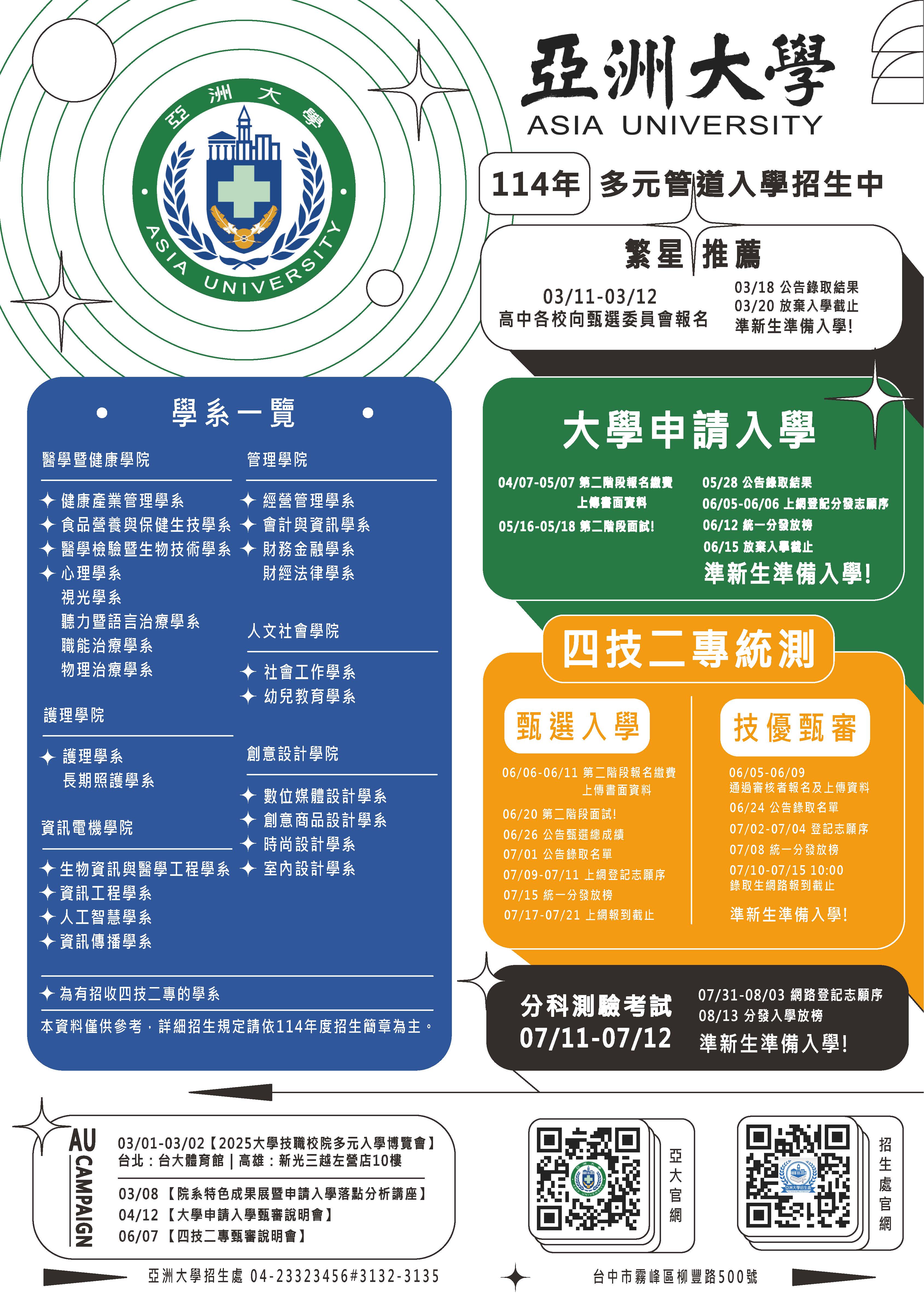 【訊息公告】亞洲大學舉辦「2025亞洲大學院系特色成果展暨大學申請入學落點分析講座」,敬請鼓勵貴校學生及家長踴躍報名參加