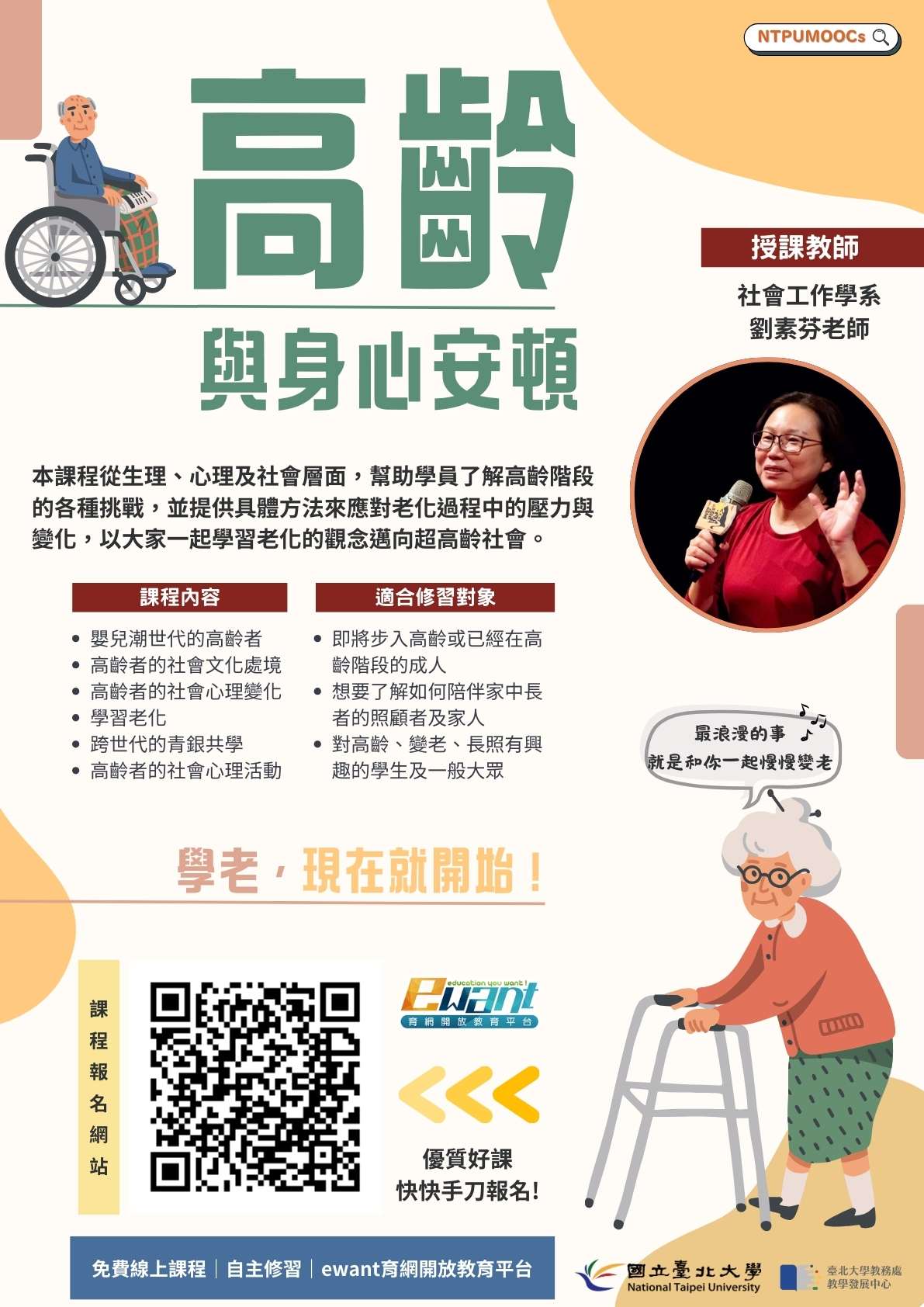 2、課程內容:「高齡與身心安頓」課程在探討隨著年齡增長,個人如何在身心兩方面進行調適,達到更平衡的生活狀態。本課程從生理、心理及社會層面,幫助學員了解高齡階段的各種挑戰,並提供具體方法來應對老化過程中的壓力與變化,以大家一起學習老化的觀念邁向超高齡社會。