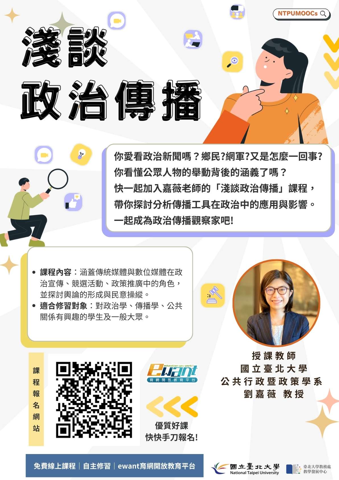 2、課程內容:「淺談政治傳播」課程旨在探討政治與傳播的交集,分析各種傳播工具在政治中的應用與影響。課程內容涵蓋傳統媒體與數位媒體在政治宣傳、競選活動、政策推廣中的角色,並探討輿論的形成與民意操縱。此課程適合對政治學、傳播學、公共關係有興趣的學生。