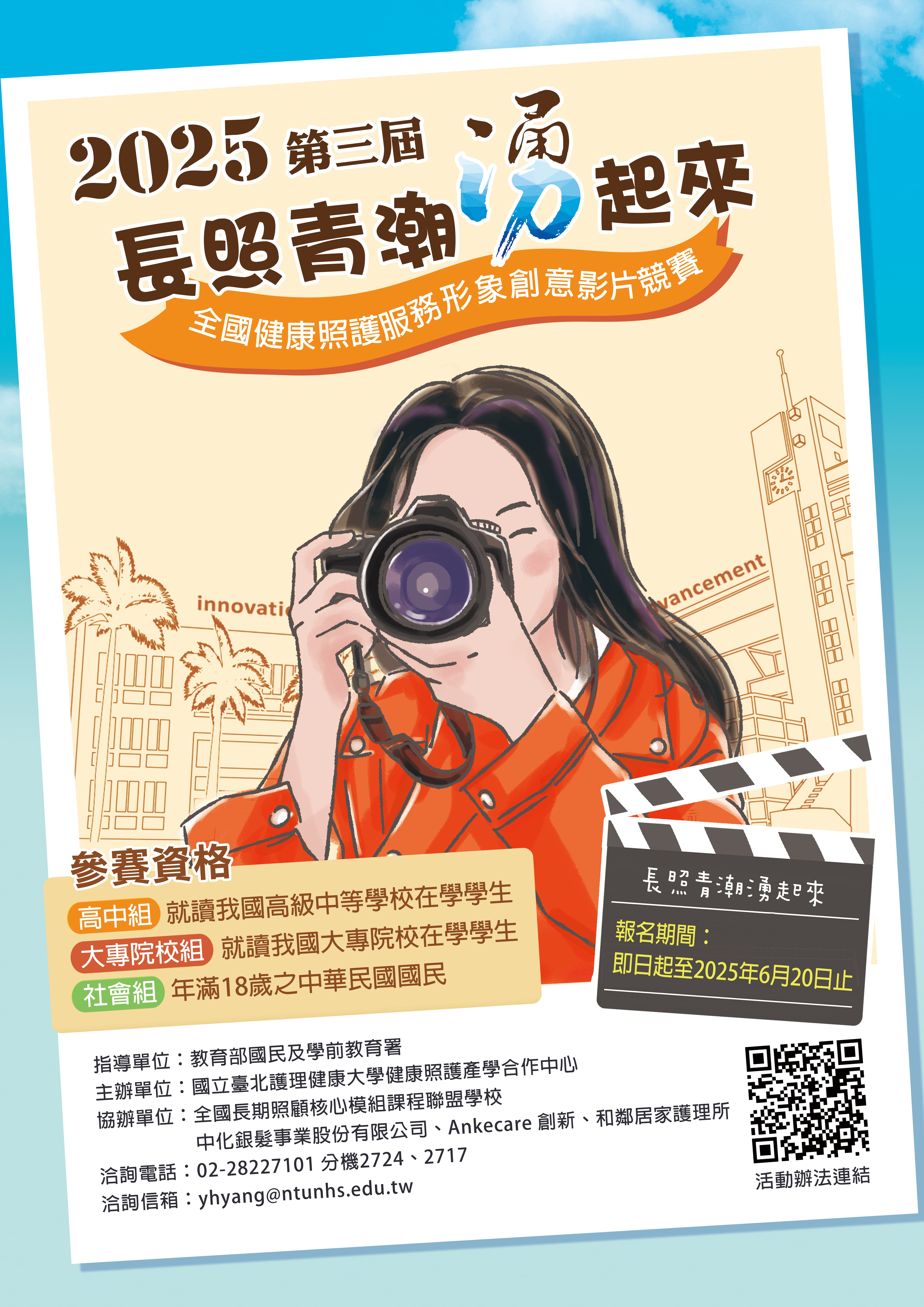 【訊息公告】國立臺北護理健康大學健康照護產學合作中心辦理「2025長照青潮湧起 來~全國健康照護服務形象創意影片競賽」徵件辦法暨海報乙份,請轉知貴校師生、機構人員及各界社會人士踴躍參與