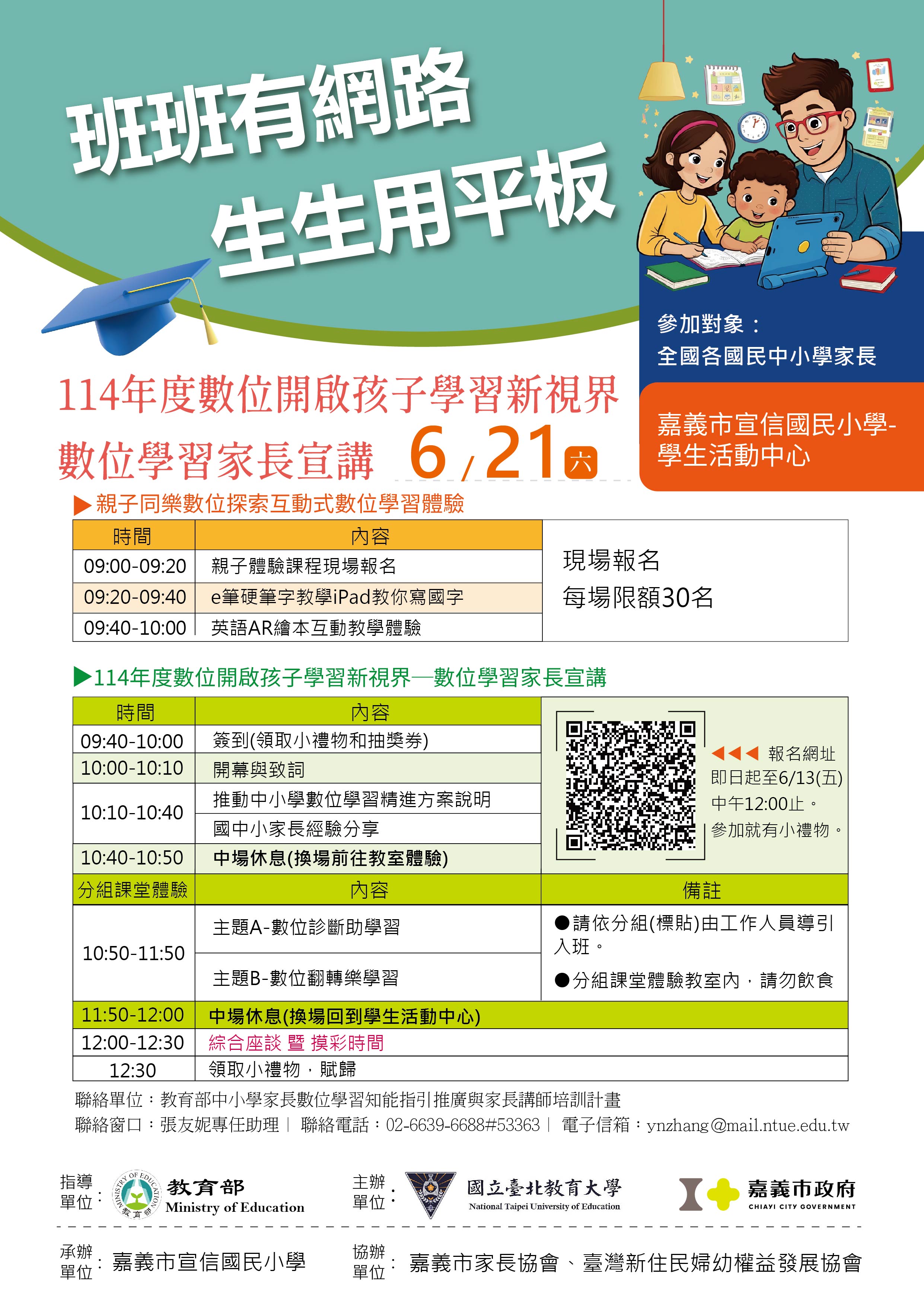 【訊息公告】嘉義市政府舉辦「114年度數位 開啟孩子學習新視界─數位學習家長宣講」活動