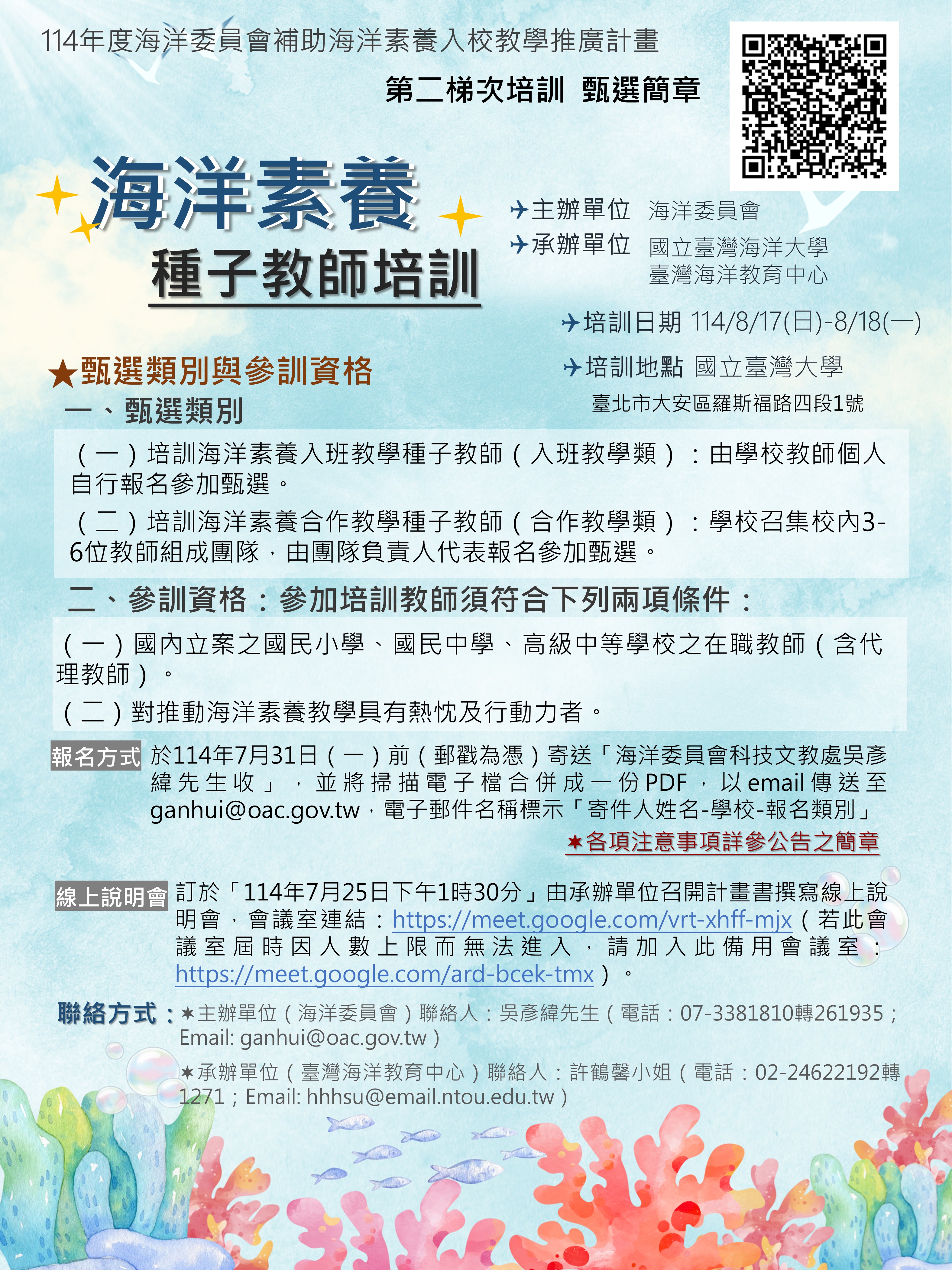 【訊息公告】國立臺灣海洋大學檢送「114年度海洋委員會補助海洋素養入校教學推廣計畫-海洋素養種子教師第二梯次培訓甄選簡章」電子檔(如 附件),敬請鼓勵符合參訓資格教師參與