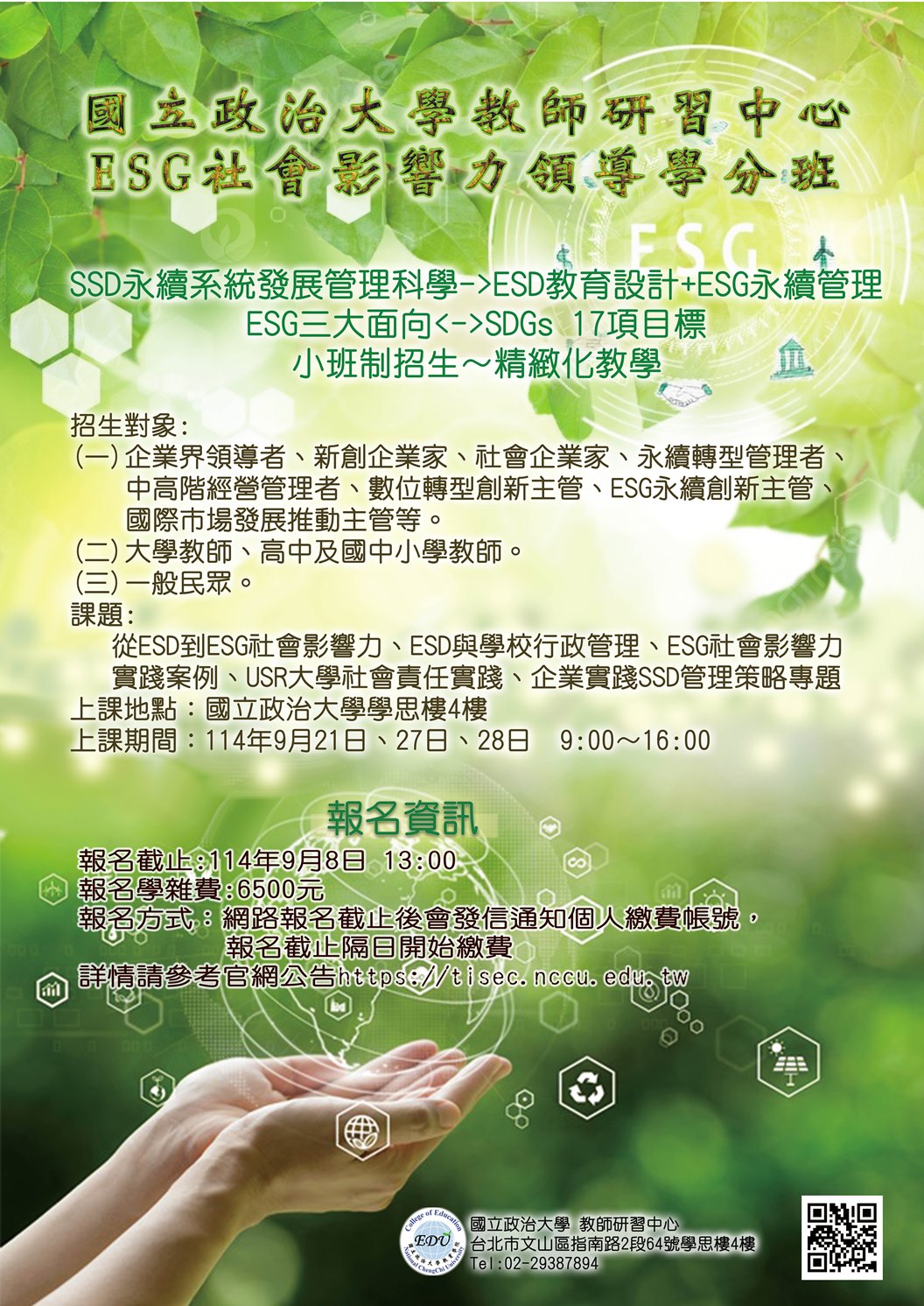 【資訊公告】「114年度ESG社會影響力領導學分班」