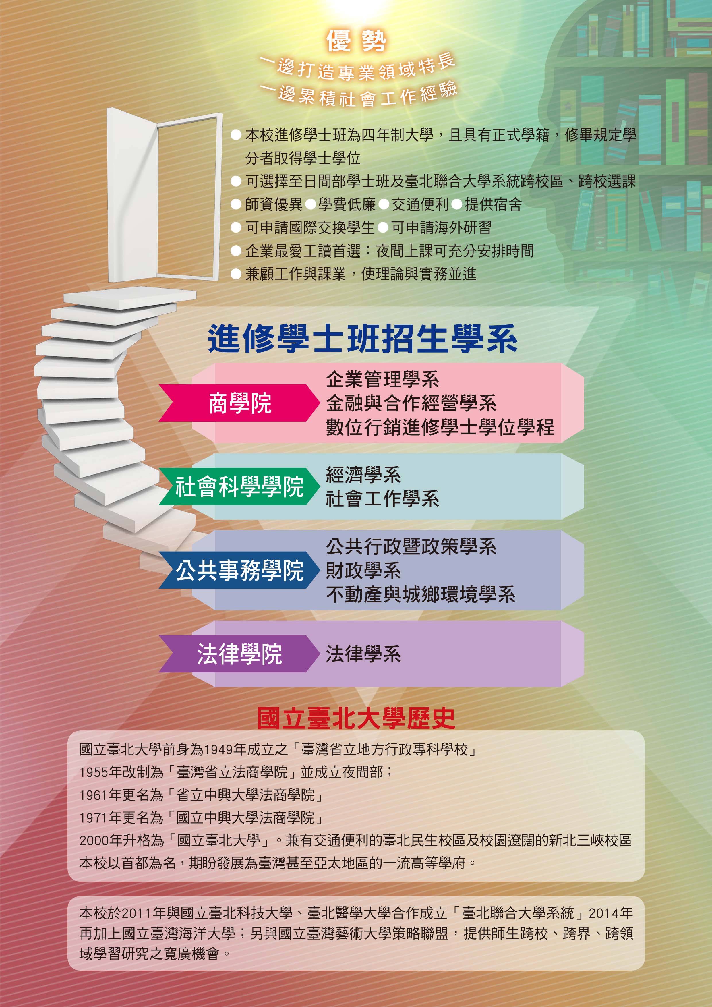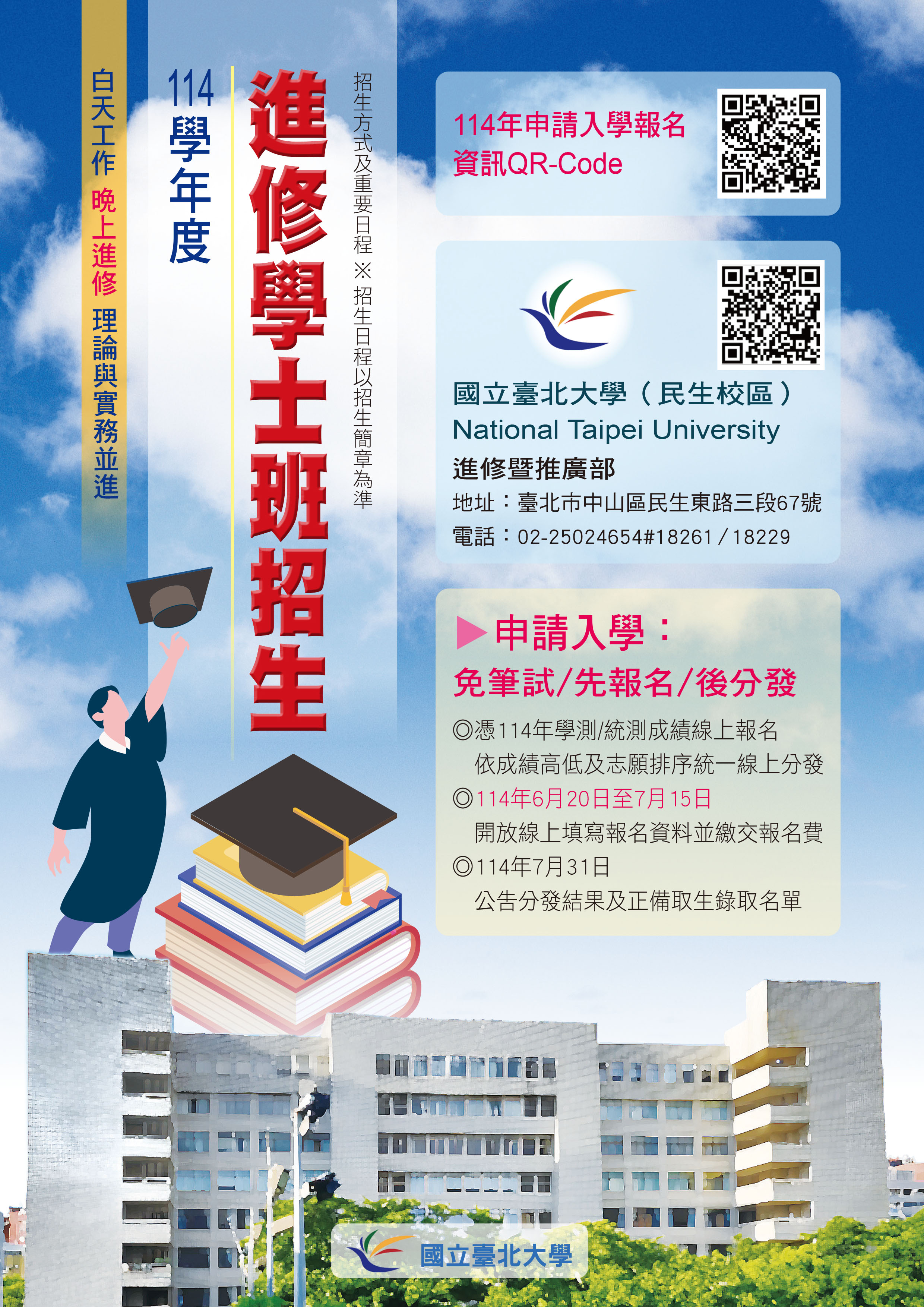 【招生訊息】國立臺北大學校114學年度進修學士班申請入學招生簡章及招生海報,敬請惠予協助公告周知並鼓勵貴校學生報考。