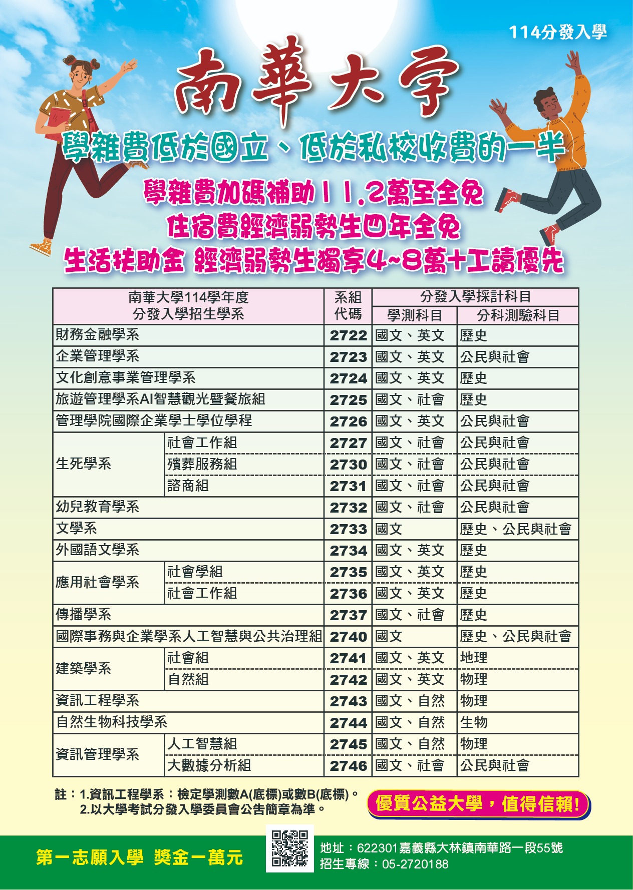 【招生訊息】南華大學114學年度「分發入學」考試招生入學管道單張文宣電子檔及紙本文宣品,懇請惠予協助於貴校網站公告宣傳及分送學生