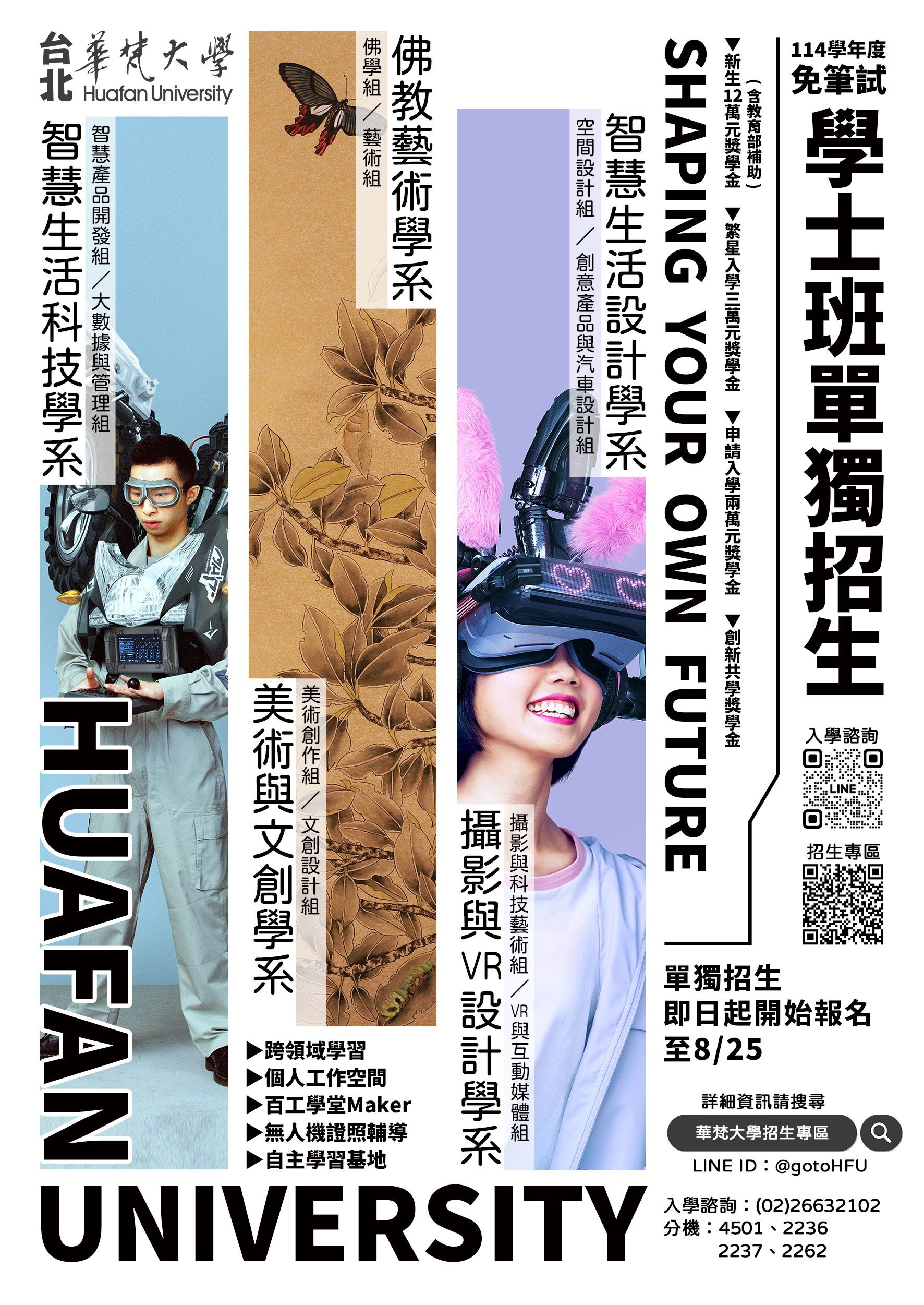 二、新生只要符合相關規定及條件最高可獲得12萬元獎學金,報名自即日起至114年8月25日止,詳情請至本校官網「招生專區」報名與查詢相關資訊。考生如有繳費、報名作業問題請洽本校公共事務處招生發展中心(02-2663-2102轉分機4501陳主任)或加入LINE官方帳號@gotohfu詢問。