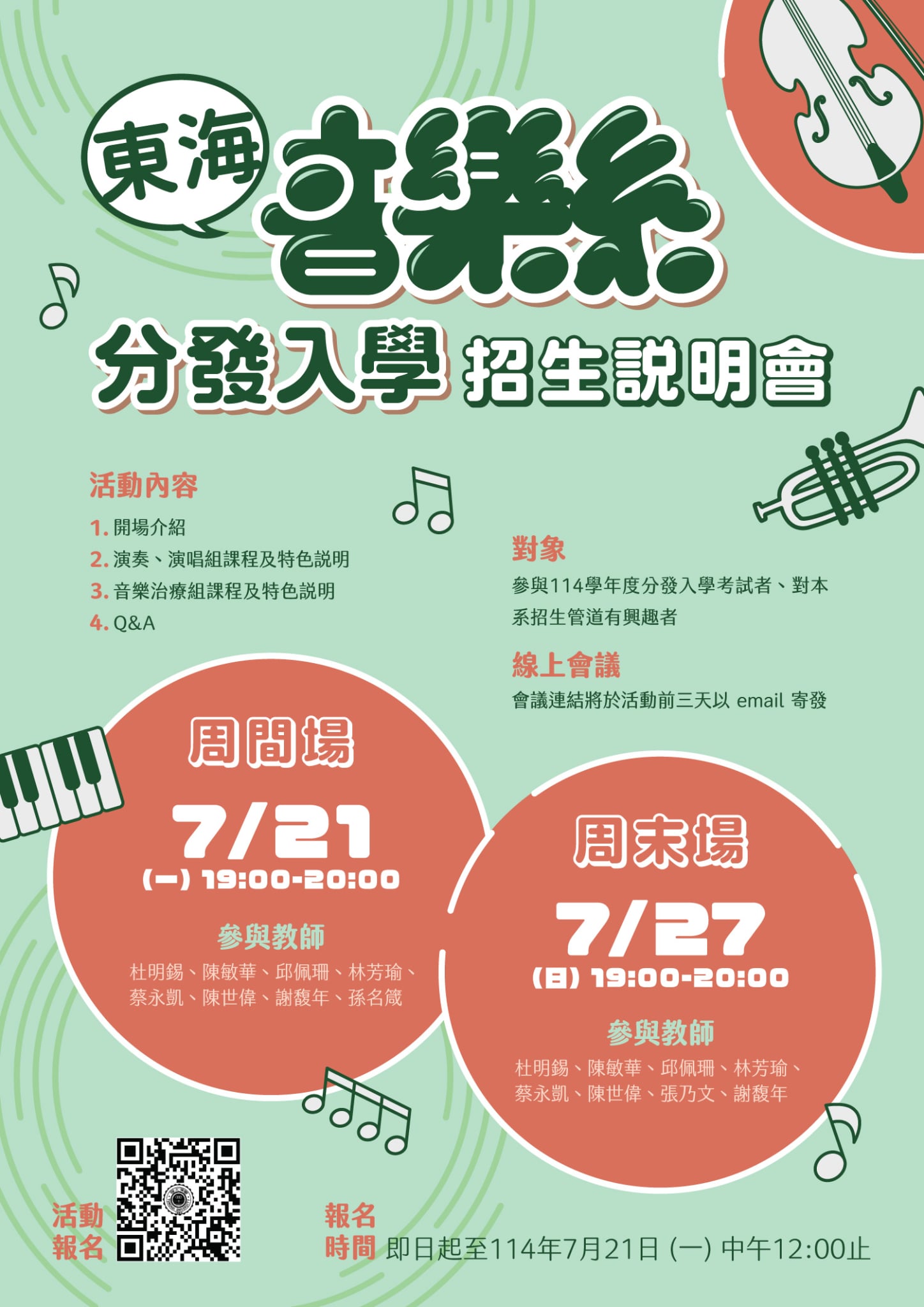 【招生訊息】東海大學音樂學系辦理二場「東海大學音樂系分發入學招生說明會」活動海報,敬請貴校惠予協助公告並鼓勵學生踴躍報名參與為荷。