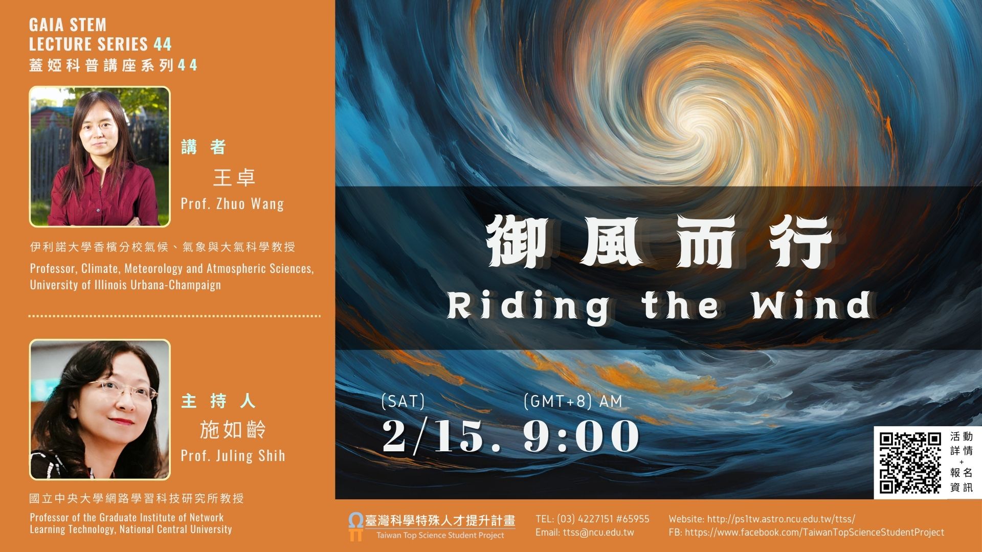 (一)講者:王卓教授 (伊利諾伊大學厄巴納-香檳分校氣候、氣象與大氣科學系教授)。 (二)講題:御風而行。