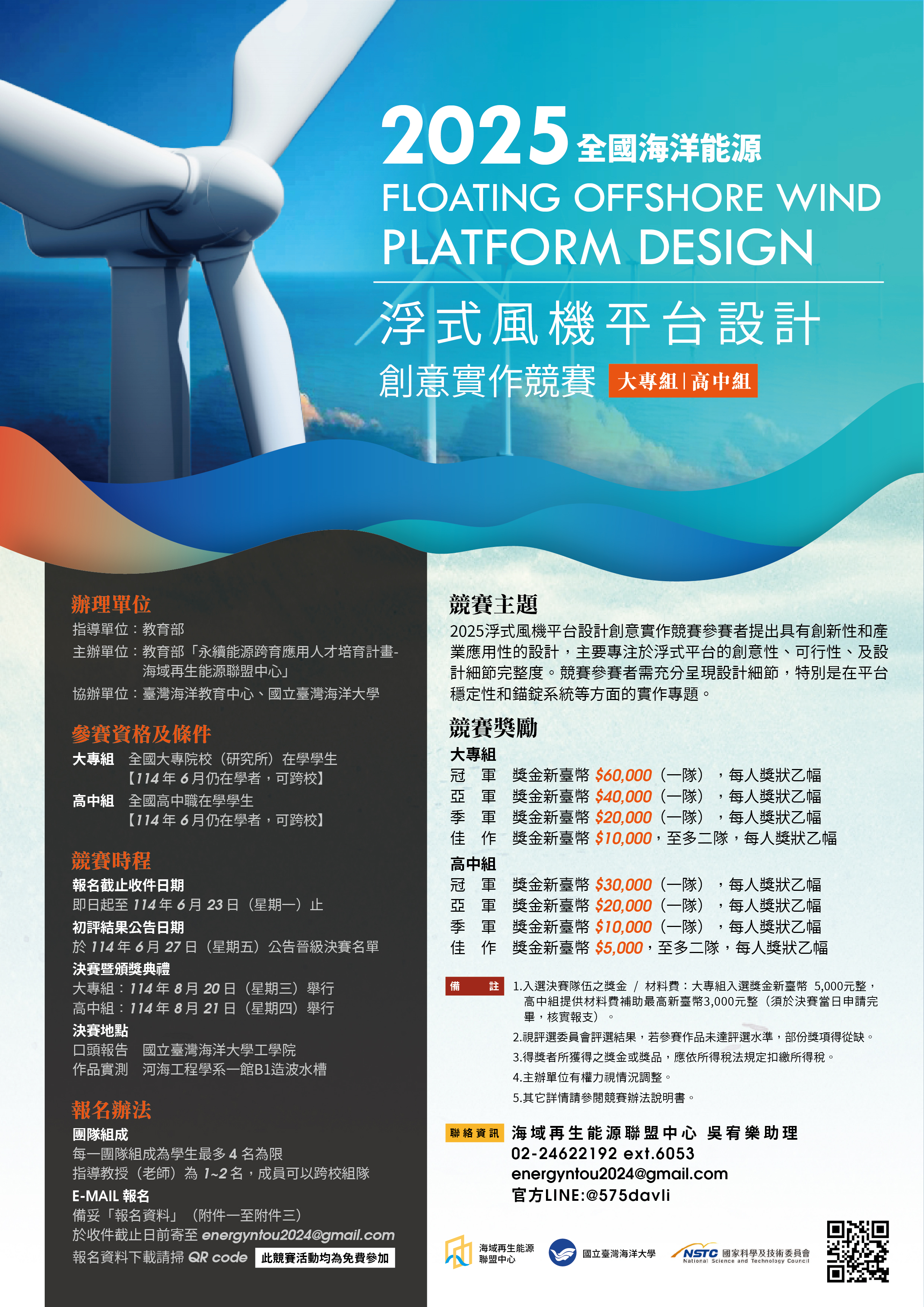 【競賽活動】全國海洋能浮式風機平台創意設計實作競賽說明及綠色能源-台灣地熱願景及解決方案工作坊