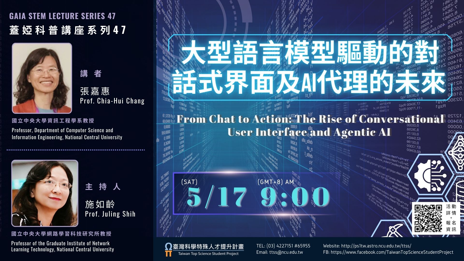 本校訂於114年5月17日辦理線上講座:《蓋婭科普講座系列 47》——「大型語言模型驅動的對話式界面及AI代理 的未來」。