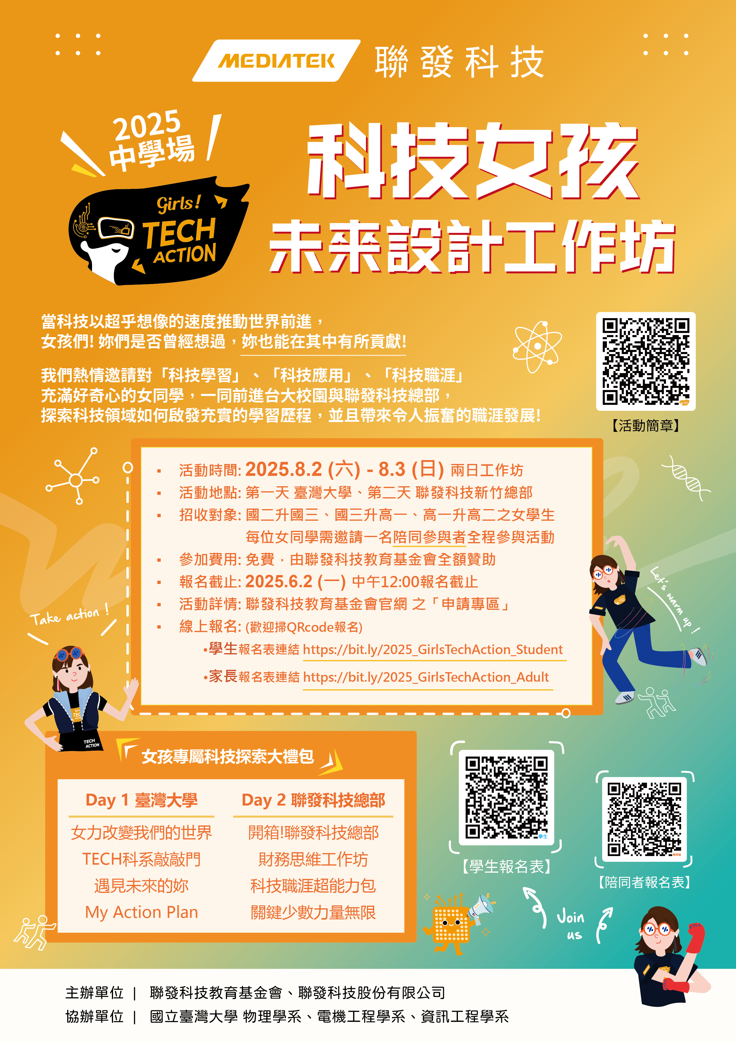 函轉財團法人聯發科技教育基金會(以下簡稱該基金會)「2025 Girls!TECH Action 科技女孩未来設計工作坊」 相關資訊,詳如說明。