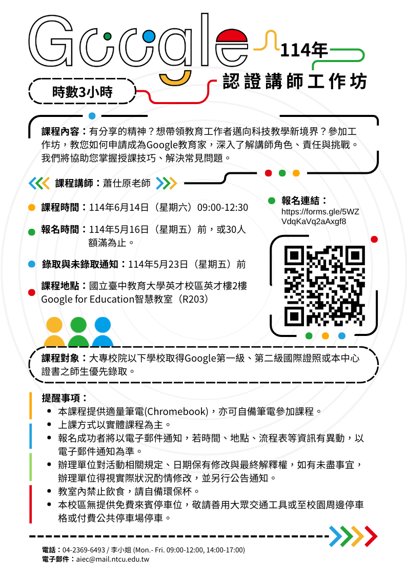 檢送國立臺中教育大學智慧教育中心辦理「114年Google 認證講師工作坊」訊息。