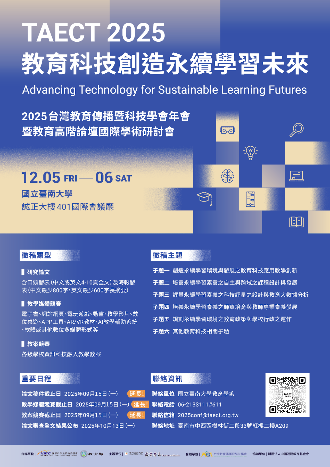 本校教育學系辦理「2025 台灣教育傳播暨科技學會年會暨教育高階論壇國際學術研討會」延長截稿期限至114年9 月15日止。
