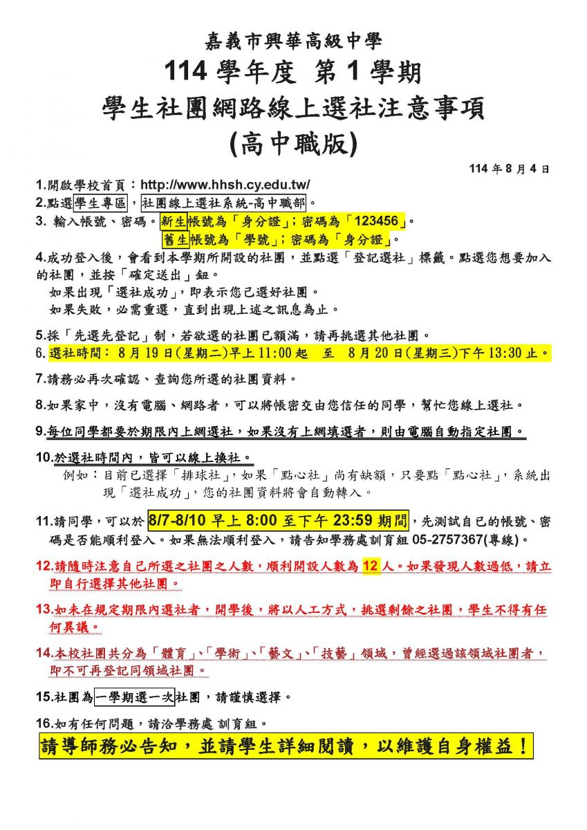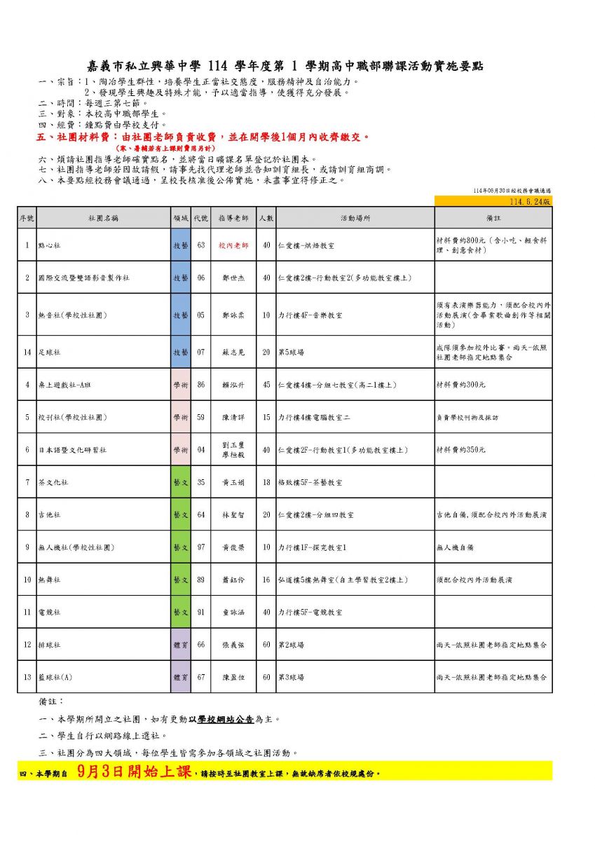【選社資訊】114.1高中職部-選社須知、社團一覽表