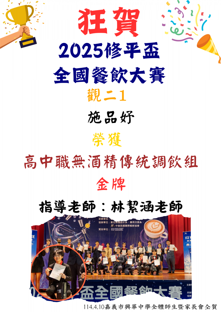 賀!本校學生參加「2025修平盃全國餐飲大賽」榮獲佳績
