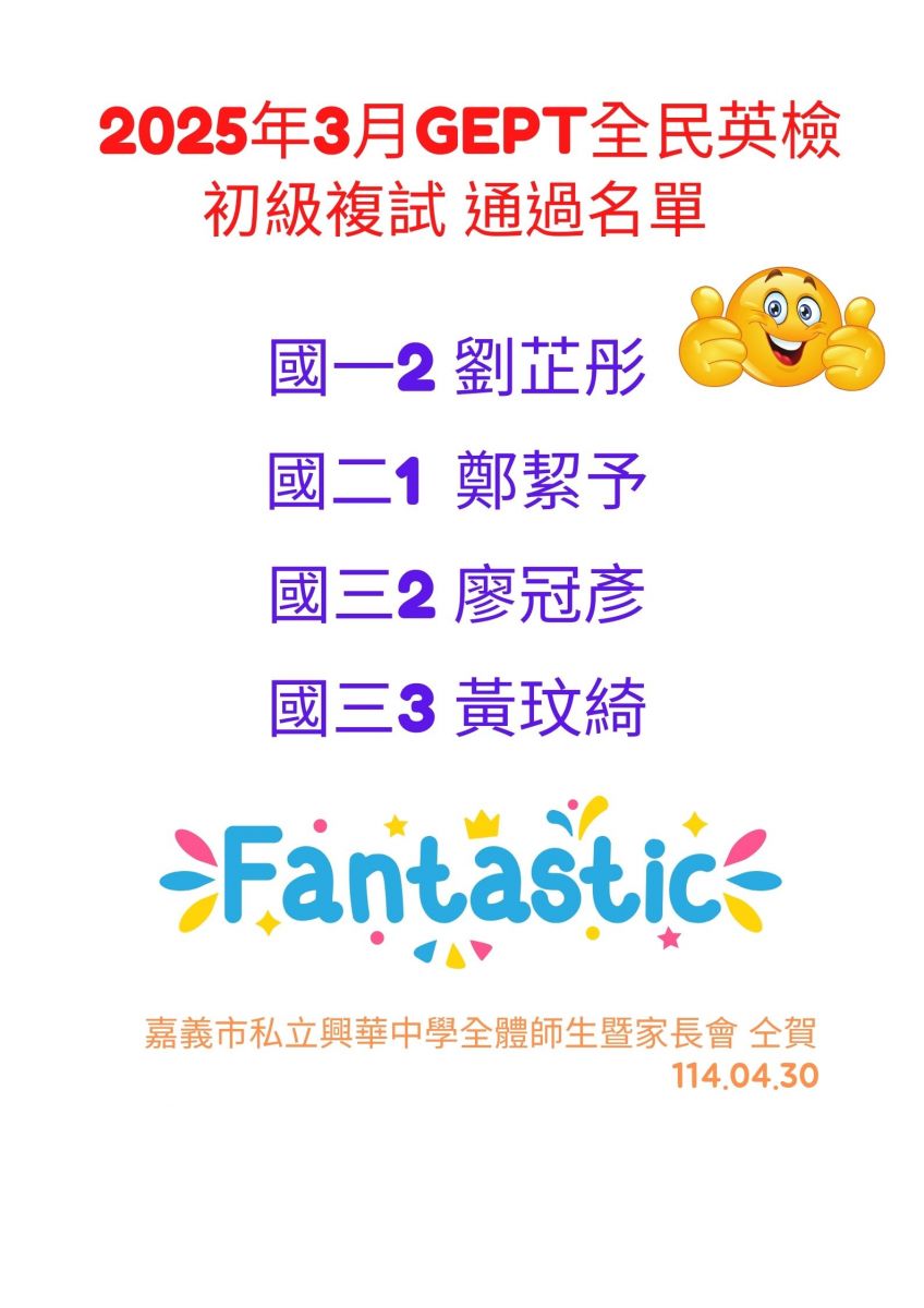 賀!!本校學生通過2025年3月GEPT全民英檢測驗,表現優異!!