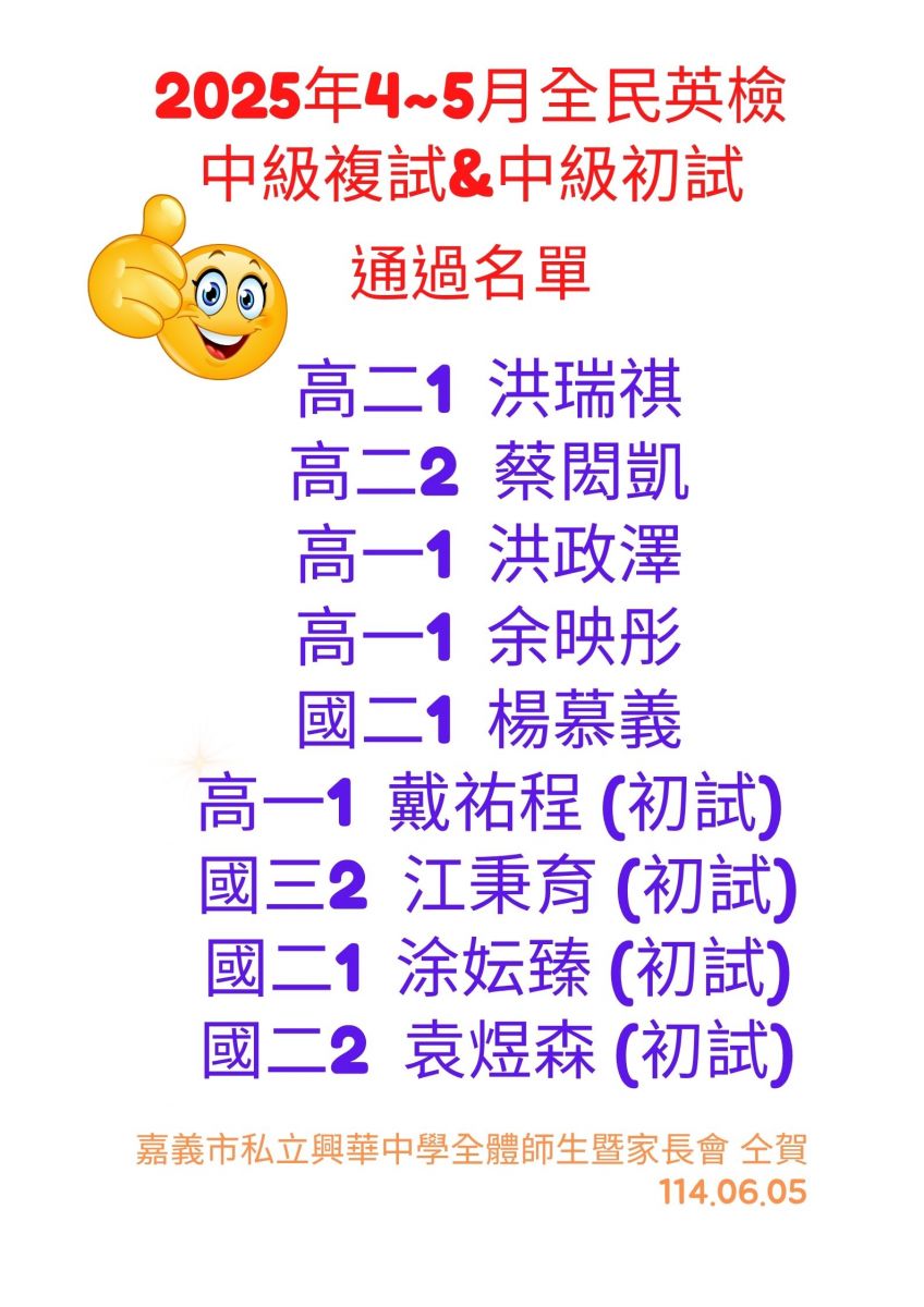 賀!!本校學生通過2025年4~5月GEPT全民英檢測驗,表現優異!!